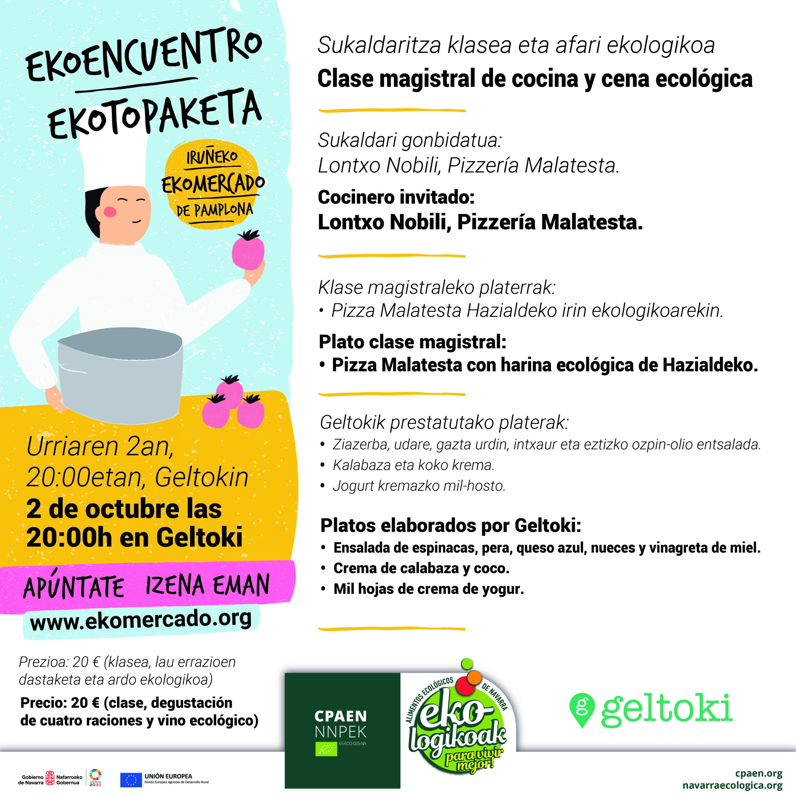 EKOtopaketaren prezioa: 20 € (Klasea, lau errazioak eta ardo ekologikoa barne)