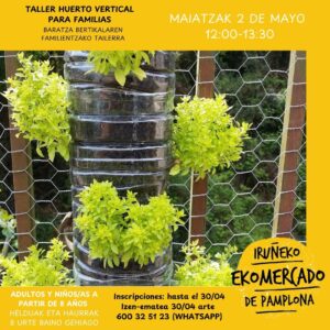 Ordutegia: 10:00etatik 14:00etara Iruñeko Autobus Geltoki Zaharraren andenetan 12:00. Baratza bertikalaren familientzako tailerra. (Helduak eta haurrak 8 urte baino gehiago) Izen-ematea 30/04 arte. 600 32 51 23 (Whatsapp)